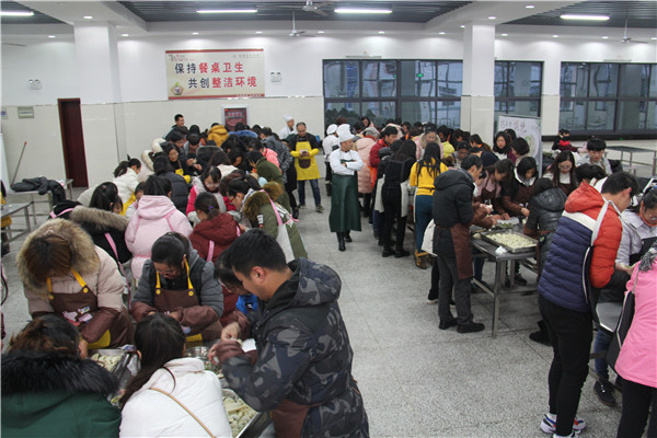 最后,教师们在食堂举行了包馄饨大赛,场面十分温馨。大家像家人一样,围坐在一起包着馄饨互道新年祝福。