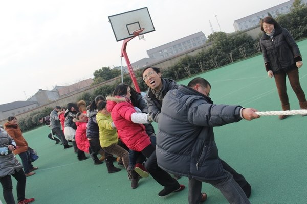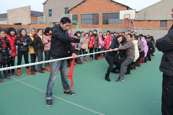 拔河比赛是大家最想挑战的项目。随着裁判老师的一声哨响,比赛开始了。双方队员紧握绳子,比赛队伍移过来又移过去,考验着组员的大局意识、协作精神和毅力。看得旁边的老师们都摩拳擦掌,跃跃欲试。其他教师和学生们自觉组成啦啦队,齐声呐喊。助威声,加油声震天,操场上一片欢腾。