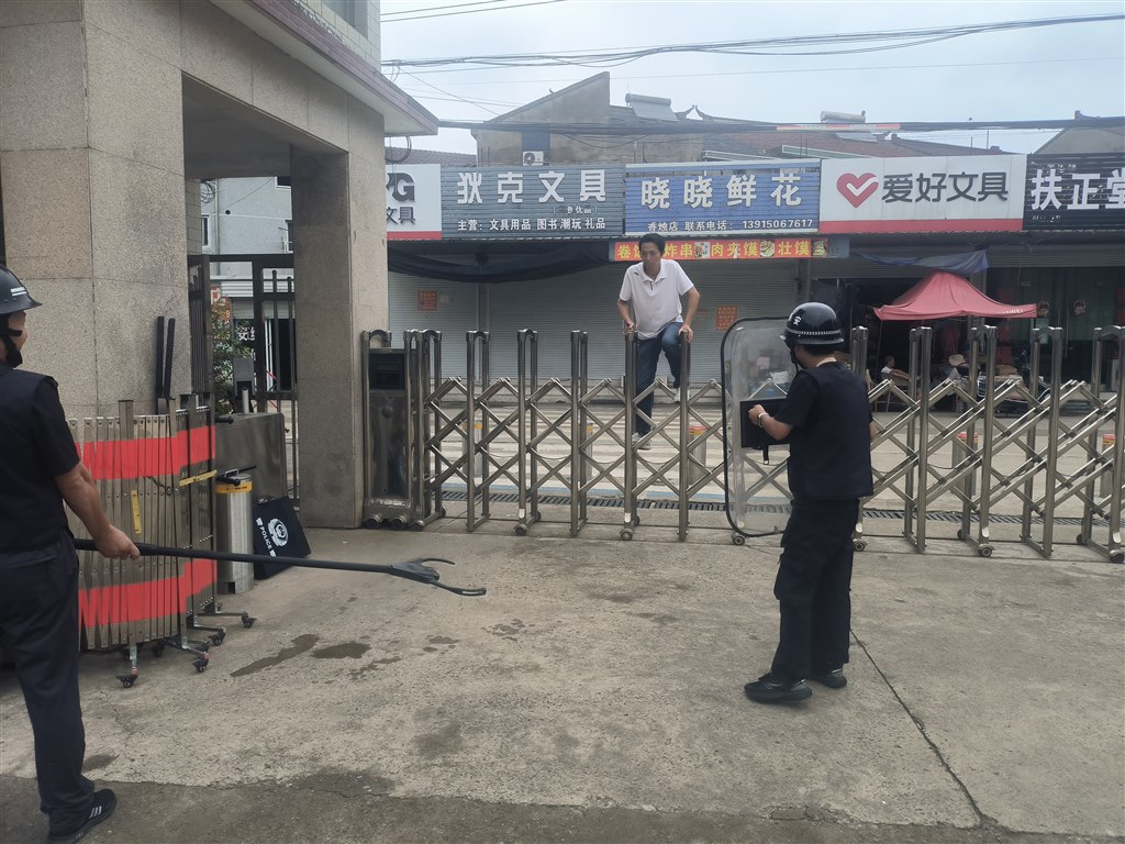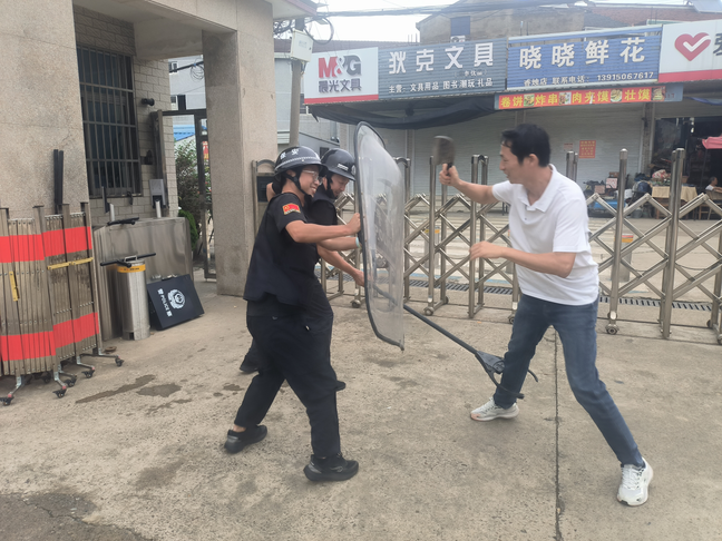 一名“歹徒”持棍在校门口大声喧哗,并试图强行闯入校园,面对这一紧急情况,在岗安保人员立刻启动一键报警装置并拨打派出所电话,同时上报学校值班校长。其他安保人员迅速采取行动,手持防护器械与“歹徒”周旋并成功将其制服。演练活动圆满结束。