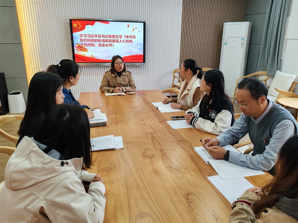 活动伊始,全体党员集中学习习近平总书记重要文章《中华民族共同体的形成和发展是人心所向、大势所趋、历史必然》。陆静副书记带领党员逐段研读文章核心内容,重点解读中华民族共同体意识的深刻内涵与时代价值,强调作为教育工作者,要将铸牢中华民族共同体意识融入教育教学全过程,引导学生树立正确的国家观、民族观。党员们结合教学实际交流学习体会,一致表示要在课堂教学中渗透民族团结教育,助力学生增强民族自豪感与凝聚力。