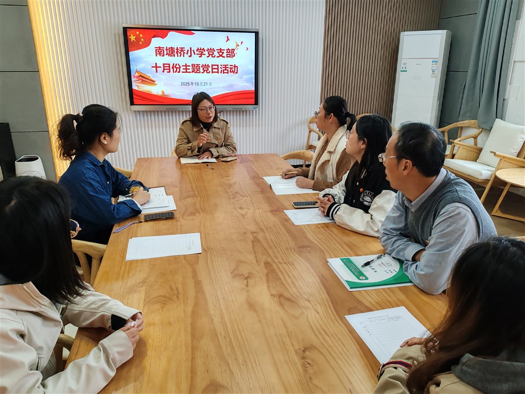 2025年10月21日中午,南塘桥小学党支部在党员活动室召开十月份主题党日活动,党支部副书记陆静主持会议,全体党员同志参加活动,以理论学习与红色教育相结合的形式,筑牢思想根基,凝聚育人共识。