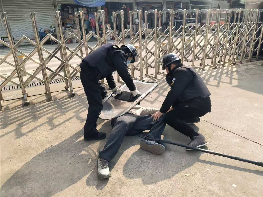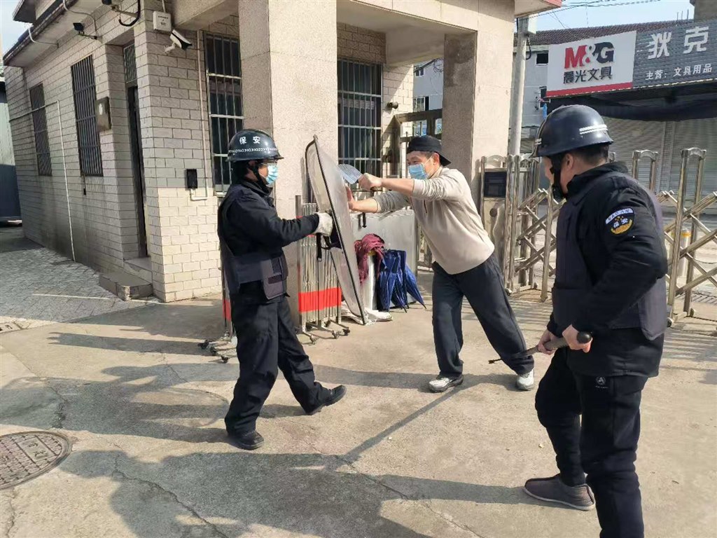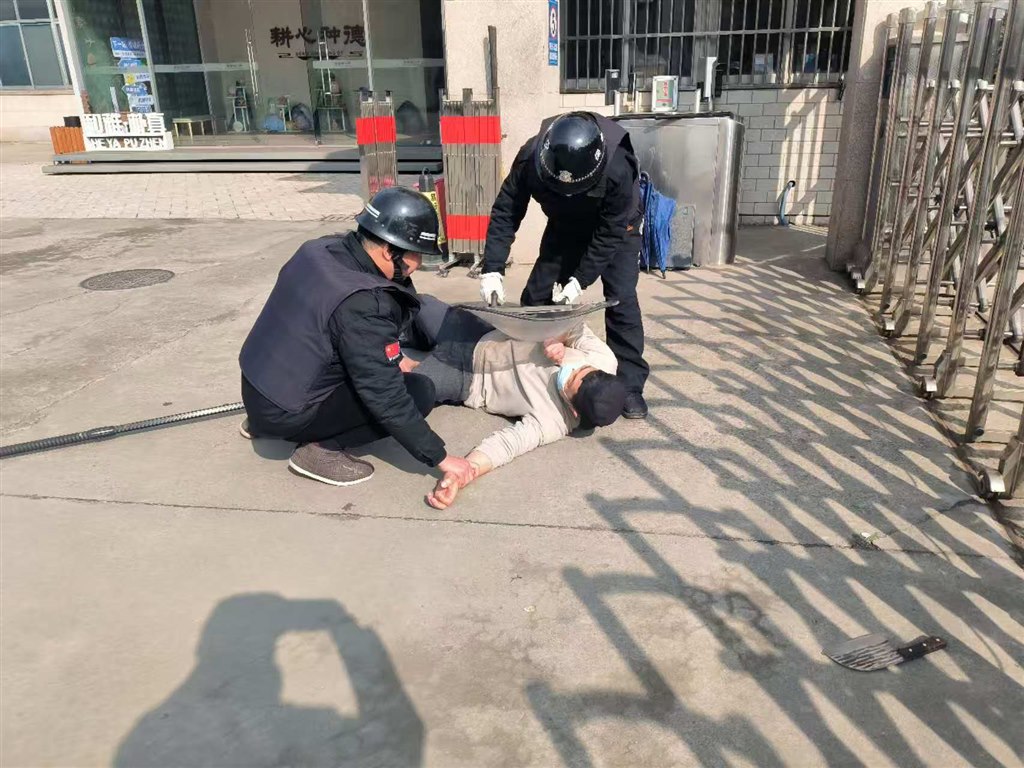 一名“歹徒”持棍在校门口大声喧哗,并试图强行闯入校园,面对这一紧急情况,在岗安保人员立刻启动一键报警装置并拨打派出所电话,同时上报学校值班校长。其他安保人员迅速采取行动,手持防护器械与“歹徒”周旋并成功将其制服。演练活动圆满结束。
